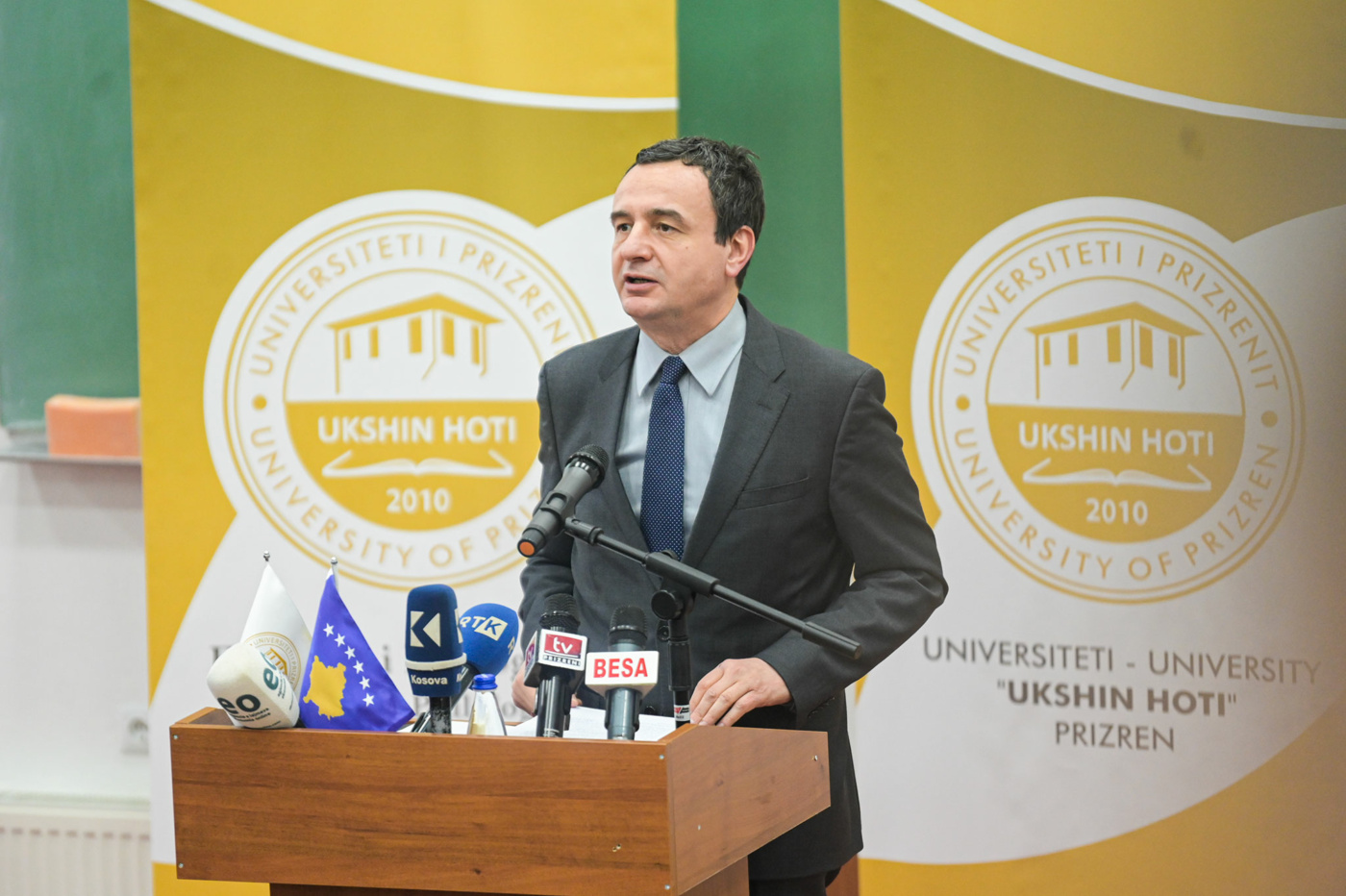 “Universitetit i Prizrenit e mban emrin e profesorit të filozofisë dhe të aktivistit të shquar me origjinë nga qyteti i Prizrenit, Ukshin Hoti, i cili u zhduk nga policia serbe nga Burgu i Dubravës, me 16 maj të vitit 1999, mirëpo fryma e tij politike, e artikuluar edhe në tekst të shkruar edhe në punë e në të vepruar, është më së miri e fiksuar në vetë emrin e Universitetit të Prizrenit.”, tha Kurti.