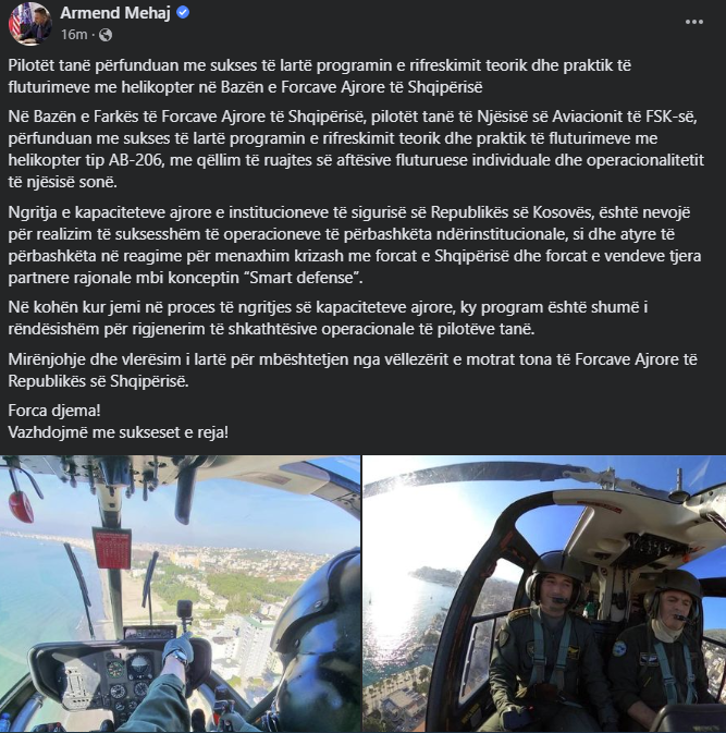 Ministri i Mbrojtjes, Armend Mehaj, përmes një shkrimi në Facebook, njoftoi se pilotët e FSK-së e kryen me sukses të lartë progragrim e rifreskimit teorik dhe praktik të fluturimeve me helikopter në Bazën Ajrore të Shqipërisë.