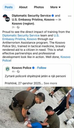 “Policia e Kosovës – Njësia Speciale Hetuese (SIU), e trajnuar në mjekësi taktike, me guxim i dha ndihmën e parë një qytetareje në nevojë. Ky është rezultati i partneriteteve efektive dhe zhvillimit profesional në veprim. Punë e shkëlqyer, Policia e Kosovës!”, thuhet në reagimin e DSS.