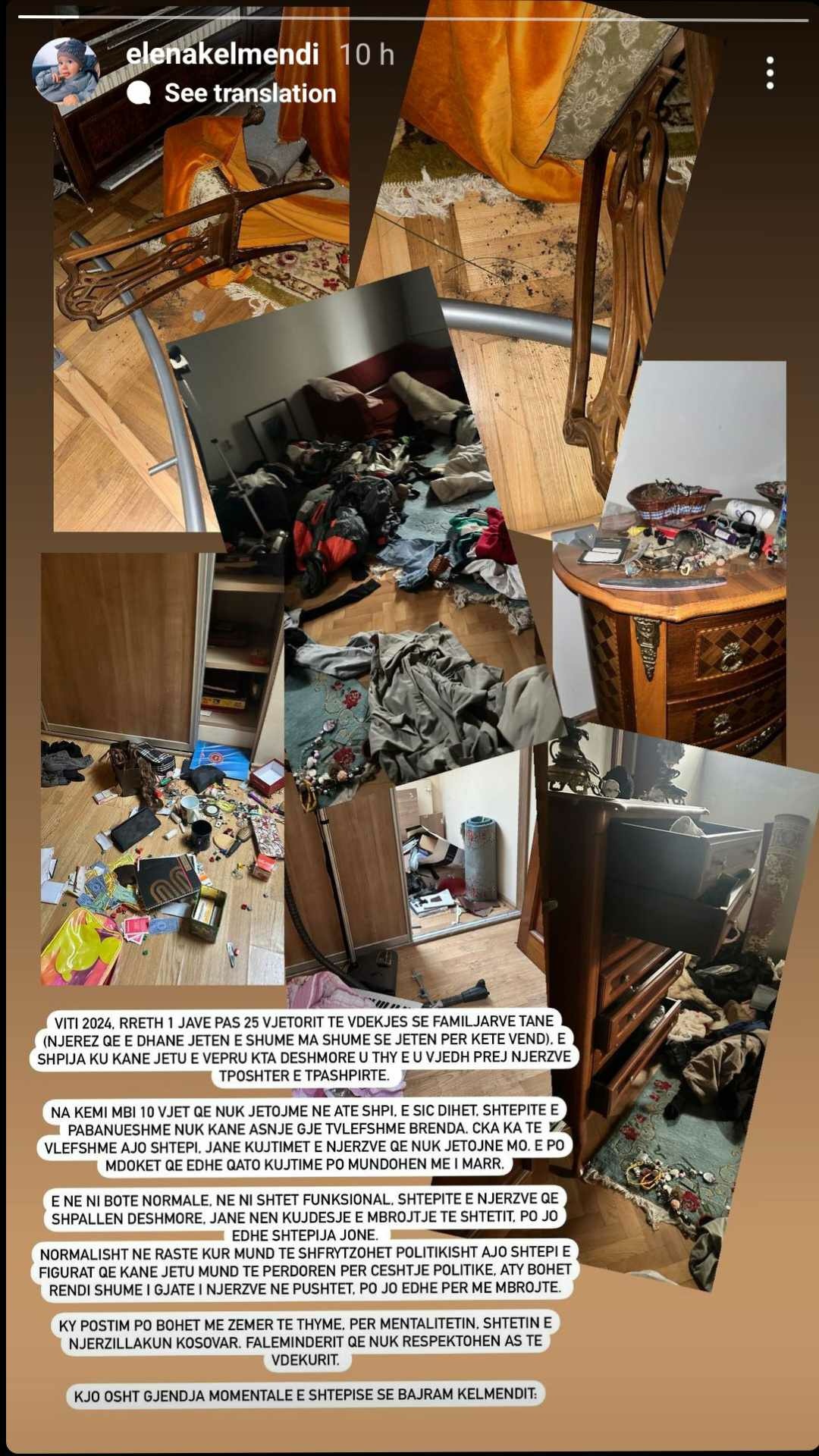 “Viti 2024 rreth një javë pas 25 vjetorit të vdekjes se familjarëve tanë, njerëzit që dhanë shumë më shumë se jetën për këtë vend, e shpija ku kanë jetu e vepruar këta deshmorë u thye e u vjedh prej njerzëve të poshtër e të pashpirtë”, ka shkruar ajo në Instagram.