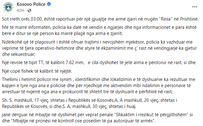 Sh. S, mashkull, 17 vjeç, shtetas i Republikës së Kosovës ,A, A mashkull, 26 vjeç, shtetas i Republikës së Kosovës, si dhe, S. A, mashkull, 30 vjeç, shtetas i huaj, janë dërguar në mbajtje në dyshimet për veprat penale “Shkaktim i rrezikut të përgjithshëm” si dhe “Mbajtje në pronësi në kontroll ose posedim të pa autorizuar të armës”, thuhet në njoftimin e Policiseë së Kosovës./arbresh.info/