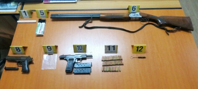 Siç thuhet në njoftimin e policisë, gjatë një kontrolli në shtëpinë e të dyshuarit janë sekuestruar një pushkë gjuetie, një pistoletë, dy karikatorë me 43 fishekë, një armë pistoletë pneumatike (me sfera) dhe 3 fishekë të armës me gas.