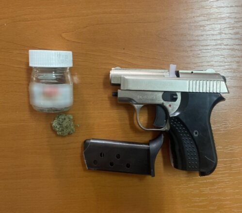 Sipas komunikatës zyrtare të policisë, gjatë kontrollit ndaj personit me inicialet E. M., në çantën e tij është gjetur një armë zjarri e llojit pistoletë, një karikator pa fishek dhe një sasi e dyshuar marihuanë e paketuar në një kavanoz të vogël.
