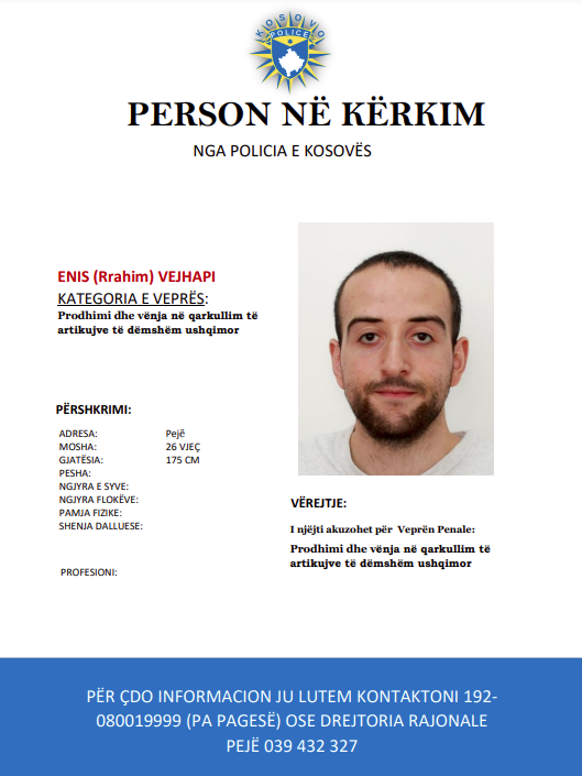 Policia e Kosovës – Drejtoria Rajonale e Policisë në Pejë, bazuar në ligj për publikimin e fotos me shënime tjera të personit të kërkuar më Urdhëresë të Gjykatës Themelore Pejë, me qëllim lokalizimin dhe rrjedhimisht arrestimin e tij, lëshon: Kërkesë për bashkëpunim me qytetarët.