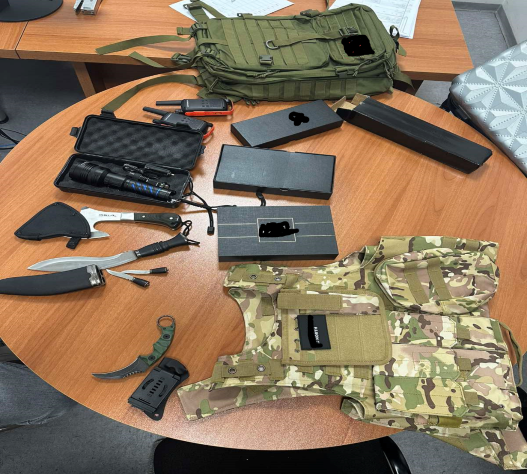 Në njoftim thuhet se janë gjetur tri thika luftarake, dy radiolidhje-motorola, një çantë ushtarake, një jelek taktik, një palë doreza, një helmetë taktike, tri bateria, dy këllëf për revole, një imtim i predhës etj, përcjell Arbresh.info.