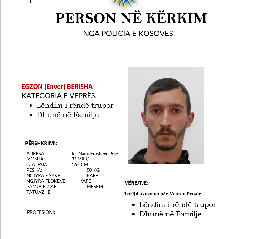 “Policia e Kosovës – Drejtoria Rajonale e Policisë në Pejë, bazuar në ligj për publikimin e fotos me shënime tjera të personit të kërkuar më autorizimin e Prokurorisë themelore nё Pejё, me qëllim lokalizimin dhe rrjedhimisht arrestimin e tij, lëshon: Kërkesë për bashkëpunim me qytetarët. Personi i kërkuar është: EGZON (Enver) BERISHA i lindur me 13.09.1993 nё Pejё. I pandehuri është i kërkuar për veprën penale: “Lёndim i rёndё trupor”, “Dhunё nё Familje”, thuhet në njoftim./Arbresh.info