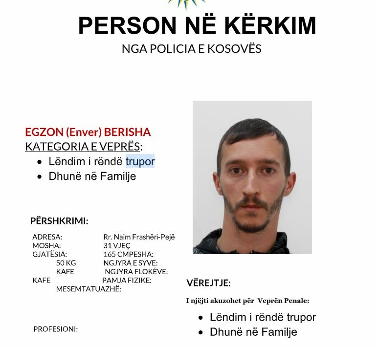 “Policia e Kosovës – Drejtoria Rajonale e Policisë në Pejë, bazuar në ligj për publikimin e fotos me shënime tjera të personit të kërkuar më autorizimin e Prokurorisë themelore nё Pejё, me qëllim lokalizimin dhe rrjedhimisht arrestimin e tij, lëshon: Kërkesë për bashkëpunim me qytetarët. Personi i kërkuar është: EGZON (Enver) BERISHA i lindur me 13.09.1993 nё Pejё. I pandehuri është i kërkuar për veprën penale: “Lёndim i rёndё trupor”, “Dhunё nё Familje”, thuhet në njoftim./Arbresh.info