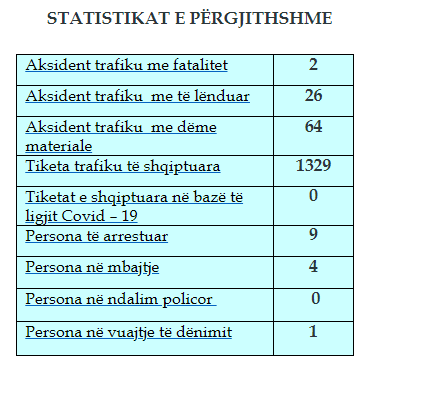 Sipas raportit të policisë, gjatë këtij periudhe janë regjistruar disa aksidente në trafikun rrugor, nga të cilat 26 kanë pasur lëndime dhe 64 kanë shkaktuar vetëm dëme materiale.