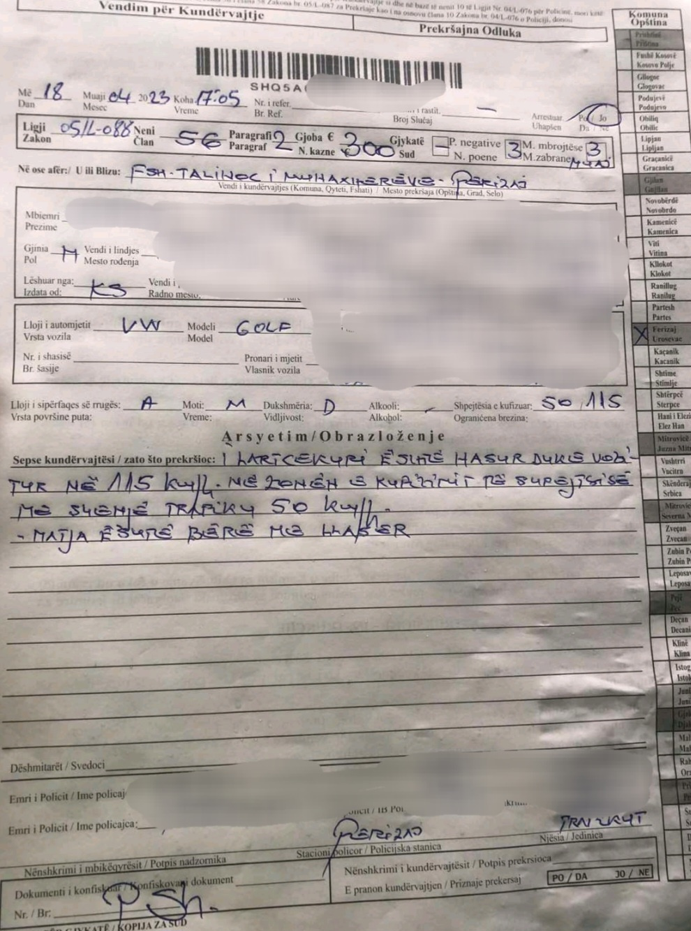 I dyshuari në zonën e kufizimit 50 km/h ka drejtuar automjetin me shpejtësi prej 115 km/h.