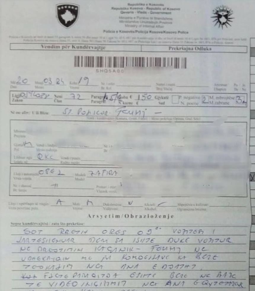 Ndaj shoferit K.K i moshës 50 vjeçare, policia ka shqiptuar gjobë për kundërvajtje 150 euro, 2 pikë negative dhe 3 muaj masë mbrojtëse, heqje e patentë shoferit, shkruan Arbresh.info