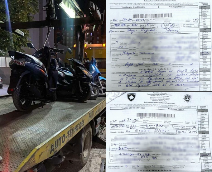 “Ndaj personit V.R ( M/K) i moshës 25 vjeçar policia i ka shqiptuar një gjobë për kundërvajtje prej shtatëqind (700) euro, tri (3) pikë negative dhe tre (3) muaj masë mbrojtëse, heqje e patentë shoferit dhe i konfiksoi motoçikletën, sepse po drejtonte motoçikletën pa kategori përkatëse dhe pa regjistrim ndërsa ndaj personit F.M (M/K) i moshës 16 vjeçar policia inicoi një fletëparaqitje pēr gjykatë, sepse po drejtonte motocikletën pa patentë shoferi dhe pa regjistim.”, thuhet në njoftim.