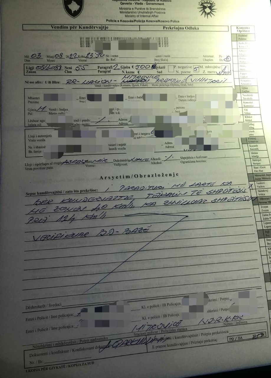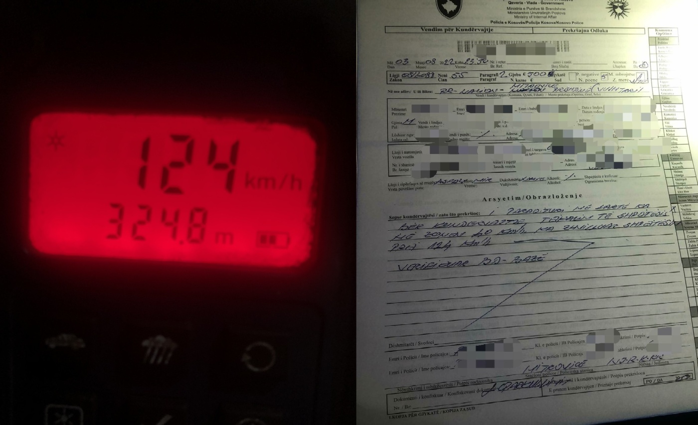 Policia në Mitrovicë njofton se ndaj një ngasësi ka shqiptuar gjobë prej 500 euro, pesë pikë negative si dhe masë mbrojtëse – ndalim i drejtimit të mjetit me veprim motorik për një vit, kjo pasi në rrugën nacionale Mitrovicë-Prishtinë, përkatësisht në zonën urbane në Vushtrri, gjatë matjes së shpejtësisë me radar, ka identifikuar ngasësin në fjalë me veturë e cila ishte duke zhvilluar shpejtësi prej 124 kilometrash në orë, në zonën ku kufizimi i shpejtësisë është 40 kilometra në orë.