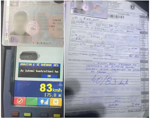 Policia e Rajonit të Gjilanit ka shqiptuar një gjobë prej 200 euro për një vozitës i cili ishte kapur duke vozitur me shpejtësi 83 km/h në një zonë ku shpejtësia ishte e kufizuar në 40 km/h.
