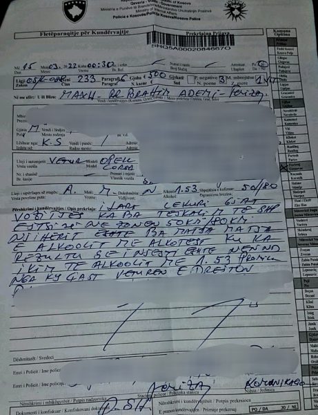 Në lidhje me këtë, “policia ndaj shoferit me inicialet N.K (M/K) i moshës 34 vjeçar i shqiptoi një gjobë sipas ligjit të komunikacionit rrugor 500 euro , 3 pikë negative dhe 1 vit masë mbrojtëse heqje e patentë shoferit, për kundërvajtjen ngasje nën ndikimin e alkoolit dhe tejkalim të shpejtësisë 50/80 km/h , ndërsa ndaj shoferit tjetër me inicialet B.Q (M/K) i moshës 50 vjeçar , policia i shqiptoi një gjobë 300 euro, 3 pikë negative dhe nëntë (9) muaj masë mbrojtëse heqje e patentë shoferit,për kundërvajtjen ngasje nën ndikimin e alkoolit””, njofton policia.