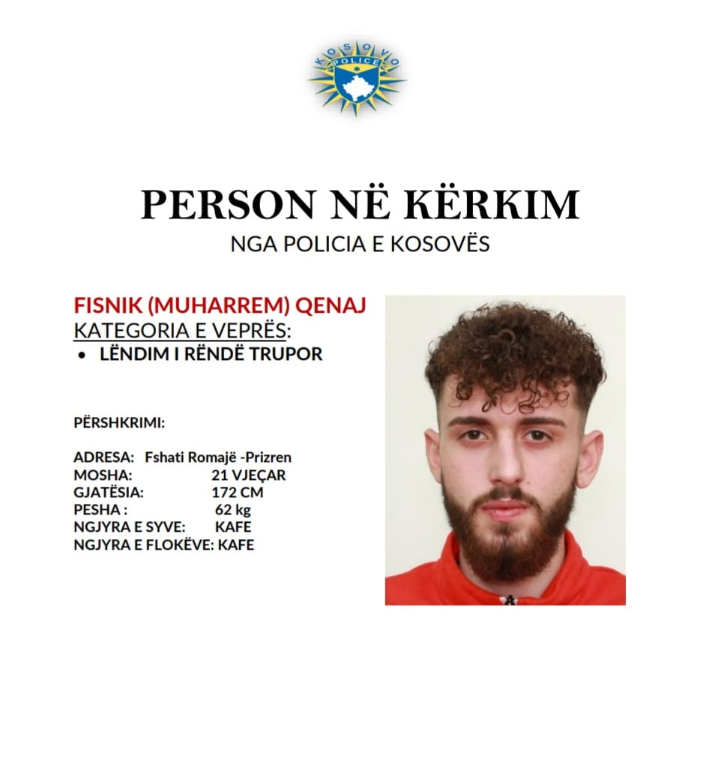 Personi i kërkuar është Fisnik (Muharrem) Qenaj, i lindur me 22.03.2003, banues në fshatin Romajë të Prizrenit, përcjell Arbresh.info.