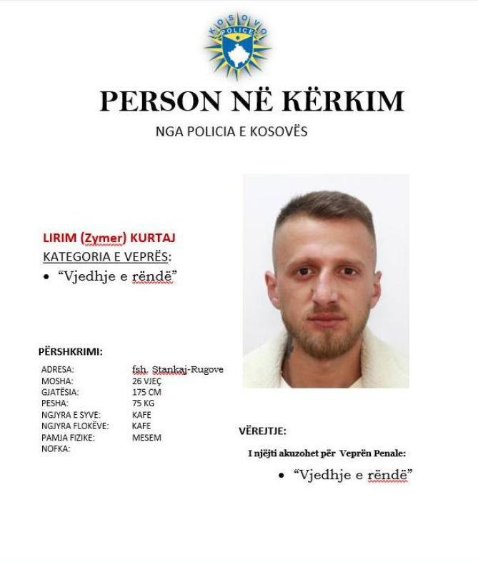 Personi i kërkuar është Lirim (Zymer) Kurtaj i lindur me 13.05.1998 në Trestenik të Pejës, ndërsa policia ka kërkuar nga qytetarët që nëse kanë ndonjë informacion për vendndodhjen e tij, të lajmëroj policinë, përcjell Arbresh.info.