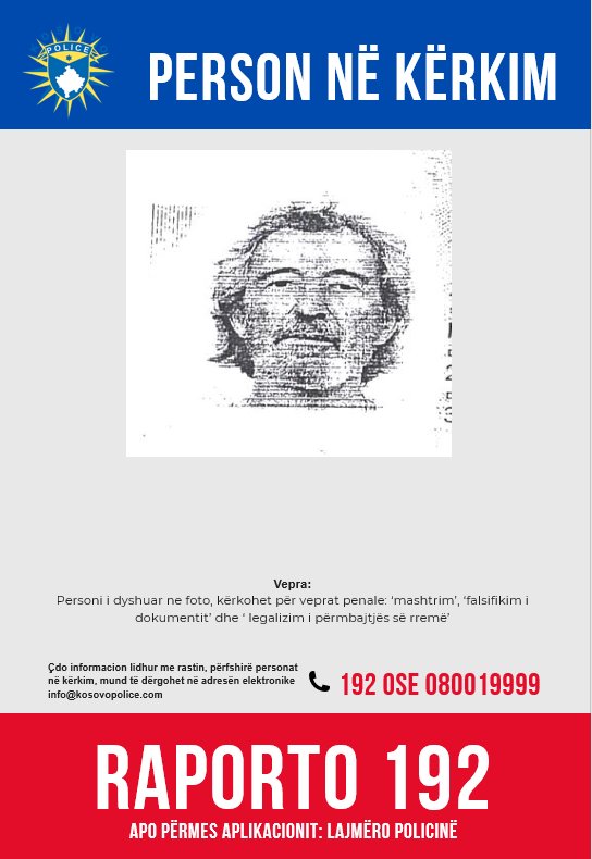 “Policia e Kosovës kërkon nga qytetarët e Republikës së Kosovës që kushdo që ka informacion për vendndodhjen e personit të dyshuar në foton e bashkangjitur, të lajmërojë Policinë e Kosovës apo të lajmërohet në stacionin më të afërt policor.