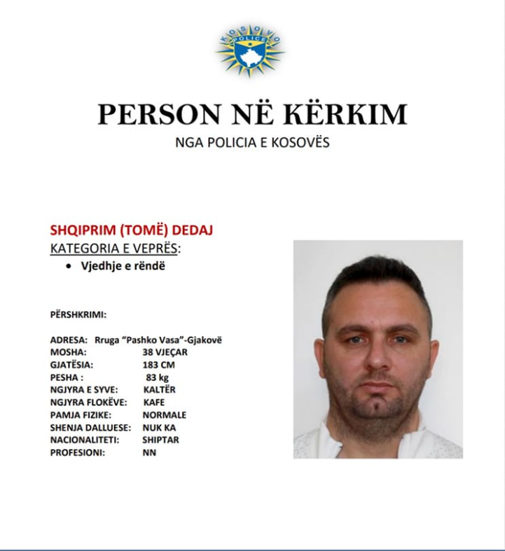 Policia e Kosovës në Gjakovë në bashkëpunim me Prokurorinë Themelore të këtij rajoni ka kërkuar ndihmën e qytetarëve për gjetjen e të dyshuarit, Shqiprim Dedaj.