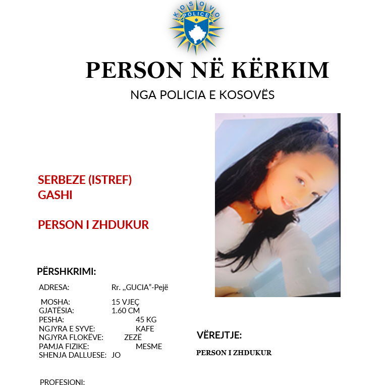 Personi i zhdukur është: SERBEZE (Istref) GASHI, e ,lindur me 06.06. 2008, në Pejë”, njofton Policia.