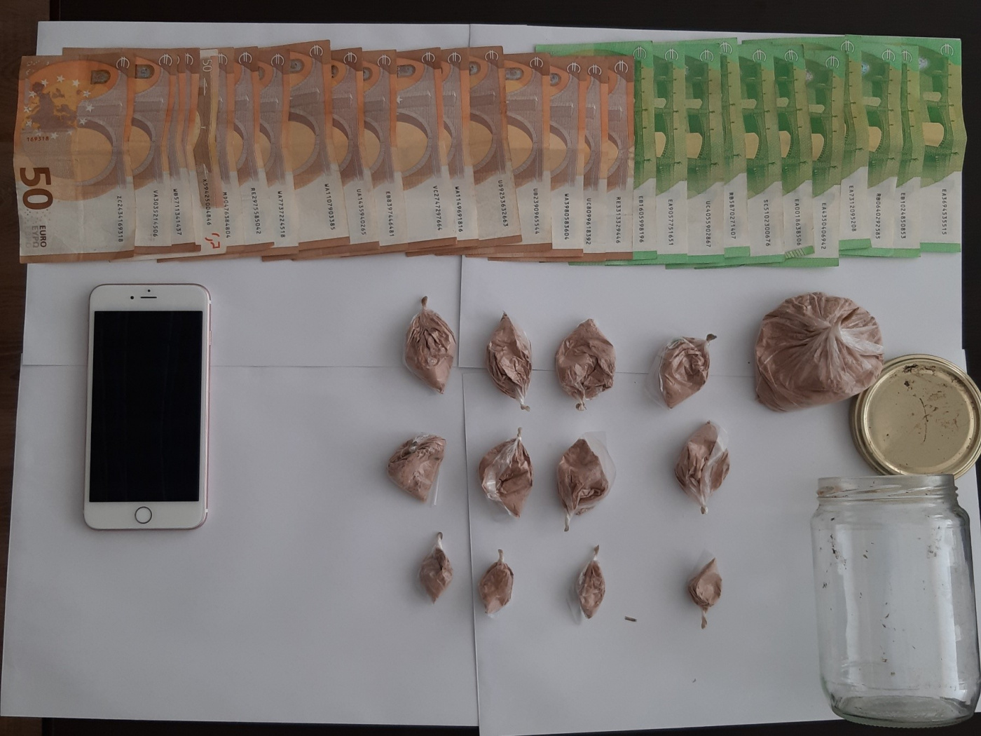 Një kavanoz qelqi brenda të cilit ishin 13 doza me substancë narkotike që dyshohet të jetë e llojit heroinë, me peshё tё përgjithshme 78.80 gramë, ku vlera e tregut në të holla është rreth 1800 euro,