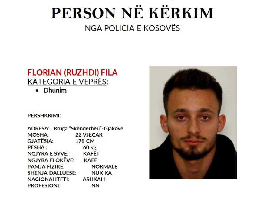 Lidhur me rastin “Dhunim” pranë Sektorit Rajonal të Hetimeve në Drejtorinë Rajonale të Policisë-Gjakovë janë duke u zhvilluar hetime intensive ku gjatë veprimeve hetimore është identifikuar i dyshuari i lartcekur.