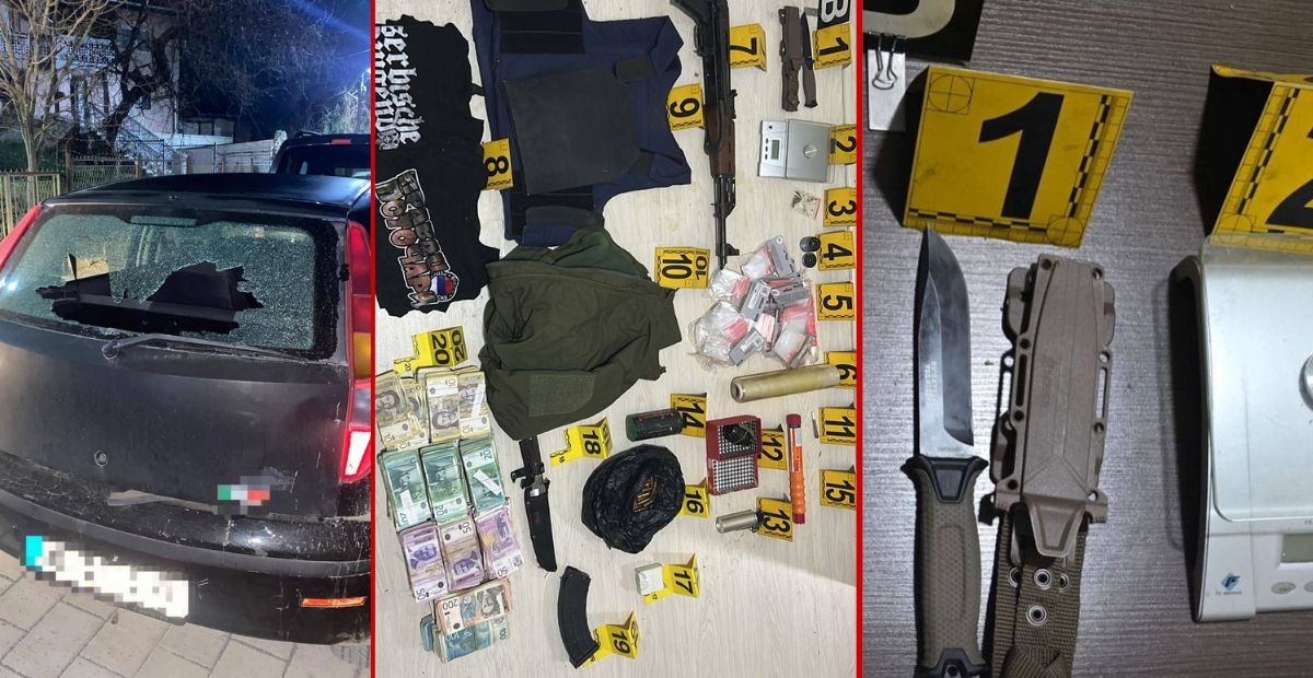 një (1) armë e gjatë AK-47, 34 fishekë të kalibrit 7.62 mm, 1 karikator me 29 fishekë të kalibrit 7.62 mm, 1 kuti me 15 fishekë të kalibrit 7.62 mm, 1 granatë dore M-75, 1 antiplumb, 2 shok-bomba, 1flakadan, 2 thika, 1 peshore, bimë narkotike, 1 mulli për bluarje, qese najloni dhe qese folie, 1 cigare e dyshuar si marihuanë, maica me mbishkrime në cirilik, si dhe një shumë parash të shtetit të Serbisë.