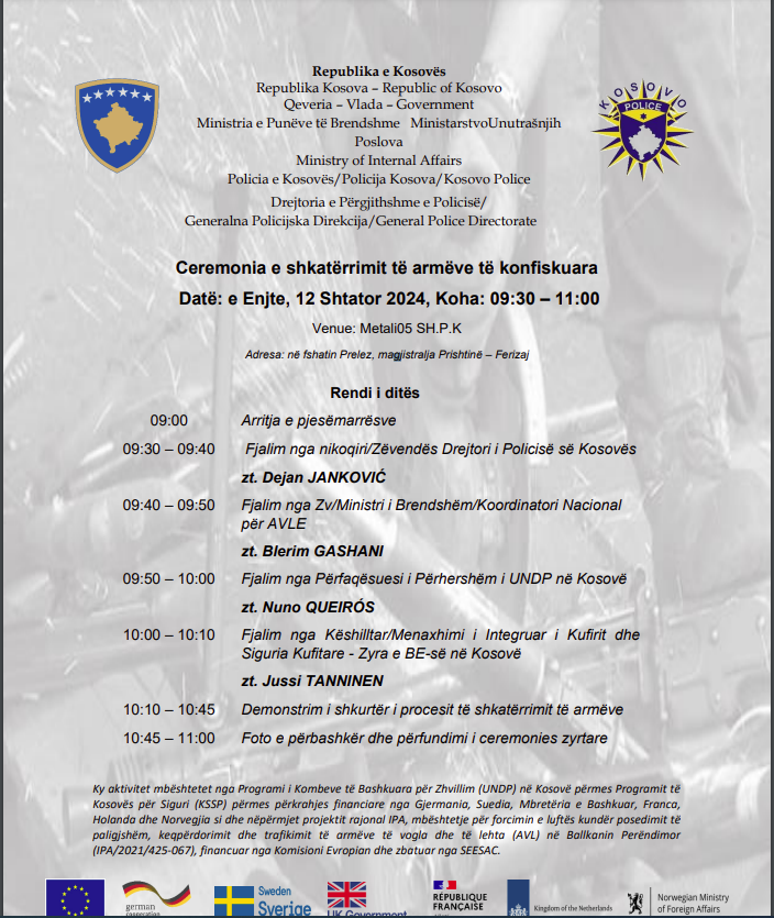 “Konfiskimi dhe shkatërrimi i këtyre armëve janë rezultati i bashkëpunimit dhe bashkëveprimit të palëve dhe institucioneve të ndryshme të zbatimit të ligjit, partnerëve ndërkombëtarë dhe qytetarëve të Kosovës në përgjithësi, andaj pritet të marrin pjesë personalitete të larta nga PK-ja, MPB-ja dhe partnerë ndërkombëtar”, thuhet në njoftimin e policisë./Arbresh.info/