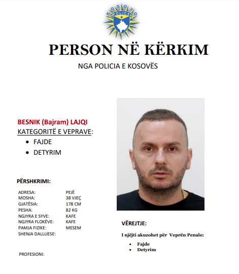 Policia e Kosovës – Drejtoria Rajonale e Policisë në Pejë, bazuar në ligj për publikimin e fotos me shënime tjera të personit të kërkuar më Urdhëresë të Gjykatës Themelore Pejë, me qëllim lokalizimin dhe rrjedhimisht arrestimin e tij, lëshon: Kërkesë për bashkëpunim me qytetarët.