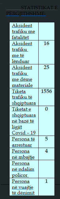 Sipas raportit të policisë, gjatë 24 orëve të fundit janë evidentuar disa aksidente në trafikun rrugor, 16 aksidente kanë qenë me lëndime e 25 me dëme materiale, shkruan Arbresh.info.