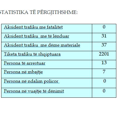 Sipas raportit të policisë, gjatë kësaj periudhe janë evidentuar disa aksidente në trafikun rrugor, ku 31 aksidente kanë qenë me të lënduar e 27 me dëme materiale.