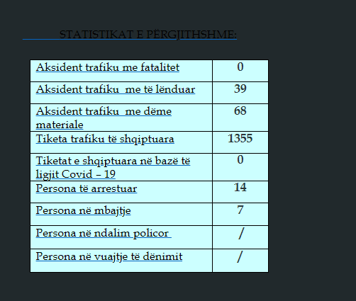 Gjatë kësaj periudhe kohore janë shkaktuar 39 aksidente trafiku me të lënduar dhe 68 me dëme materiale.