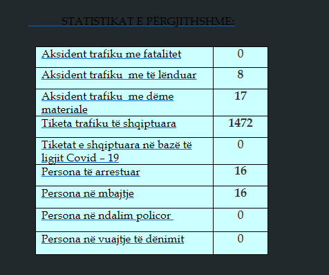 Gjatë kësaj periudhe kohore kanë ndodhur 8 aksidente me të lënduar dhe 17 me dëme materiale.