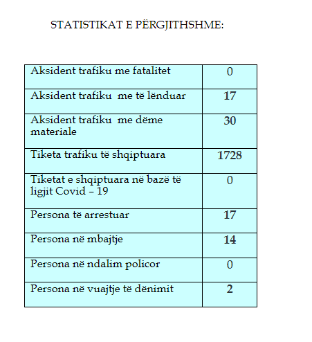 Gjatë kësaj periudhe kohore janë evidentuar disa aksidente në trafikun rrugor, 17 aksidente kanë qenë me lëndime, ndërsa 30 me dëme materiale.
