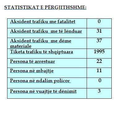 Sipas policisë, gjatë kësaj periudhe kohore janë evidentuar disa aksidente në trafikun rrugor, ku 31 kanë qenë me lëndime, ndërsa 37 me dëme materiale.