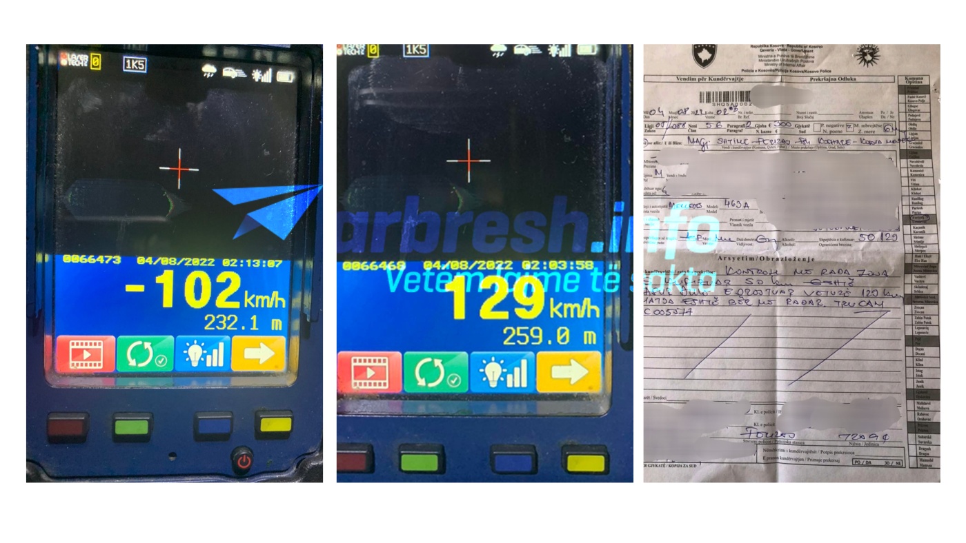 I njëjti shofer, pasi ka marrë gjobën është nisur vrullshëm në drejtim të Ferizajt, duke zhvilluar shpejtësi 102 km/h, në po të njëjtën zonë të kufizimit 50 km/h. Matja është bërë nga prapa me radarë, ndërsa ndaj tij është shqiptuar edhe një gjobë për kundërvajtje, prej 150 eurove.