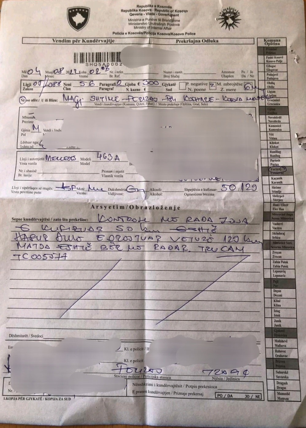 Policia Rajonale e Komunikacionit Rrugor në Ferizaj, sot në ora 02:03 të mëngjesit ka ndaluar shoferin i cili me automjetin e tij të udhëtarëve shkaktoi kundërvajtje në komunikacion, tejkalim i shpejtësisë në rrugën magjistrale Shtime-Ferizaj, më saktësisht në fshatin Koshare të Ferizajt, ku në zonën e kufizimit 50 km/h zhvilloi shpejtësi 129 km/h.