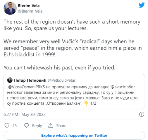 Vela i ka replikuar Petkoviqit përmes një cicërime në Twitter, duke i përmendur të kaluarën e Vuçiqit, kur ai aspak nuk i shërbente paqes në rajon.