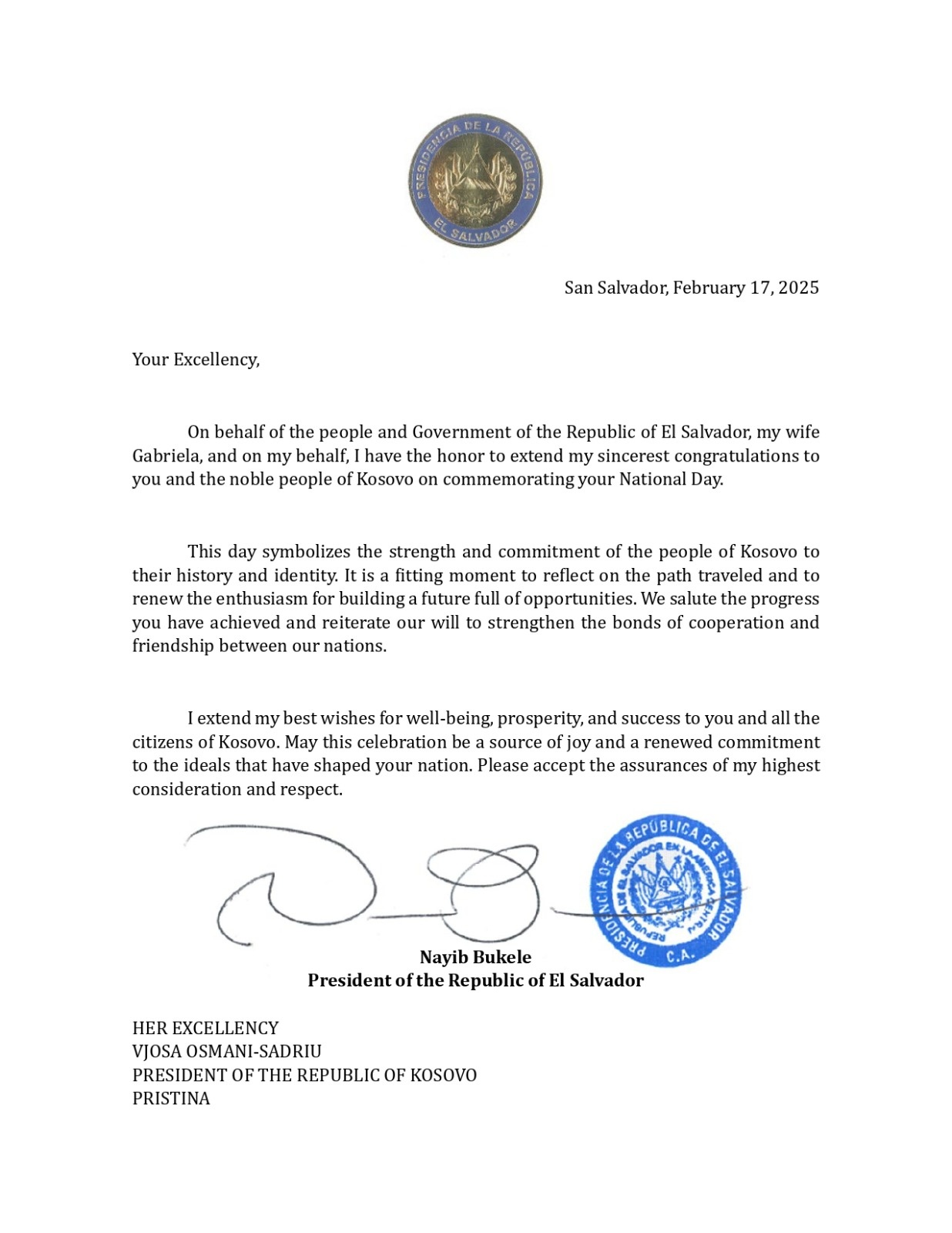 Në mesazhin e tij, Presidenti Bukele ka shprehur urimet më të sinqerta për Presidenten Osmani dhe për qytetarët e Kosovës, duke e cilësuar këtë ditë si një simbol të forcës dhe përkushtimit të popullit të Kosovës ndaj historisë dhe identitetit të tyre.