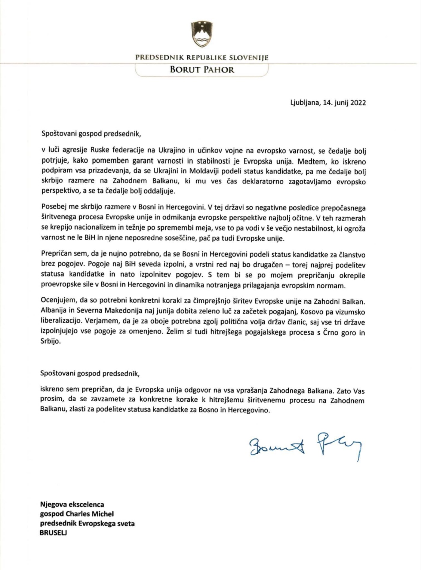 “Duke pasur parasysh agresionin e Federatës Ruse ndaj Ukrainës dhe efekteve të luftës në sigurinë evropiane, të cilat po shtohen, duhet të potencohet rëndësia e Bashkimit Evropian si një garantues i sigurisë dhe stabilitetit. Ndërsa unë sinqerisht mbështes të gjitha përpjekjet për t’i dhënë Ukrainës dhe Moldavisë statusin e kandidatit, jam gjithnjë e më shumë i shqetësuar për situatën në Ballkanin Perëndimor, të cilit ne vazhdimisht po i shprehim garanci dhe perspektivë evropiane, por rajoni po largohet gjithnjë e më shumë”, ka shkruar kryetari slloven.