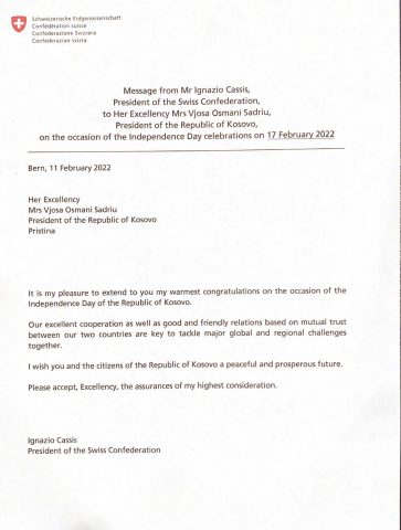 Presidentja e Republikës së Kosovës, Vjosa Osmani, me rastin e 17 Shkurtit, ditës së pavarësisë së shtetit, ka pranuar telegram urimi nga President i Konfederatës Zvicerane, Ignazio Cassis.