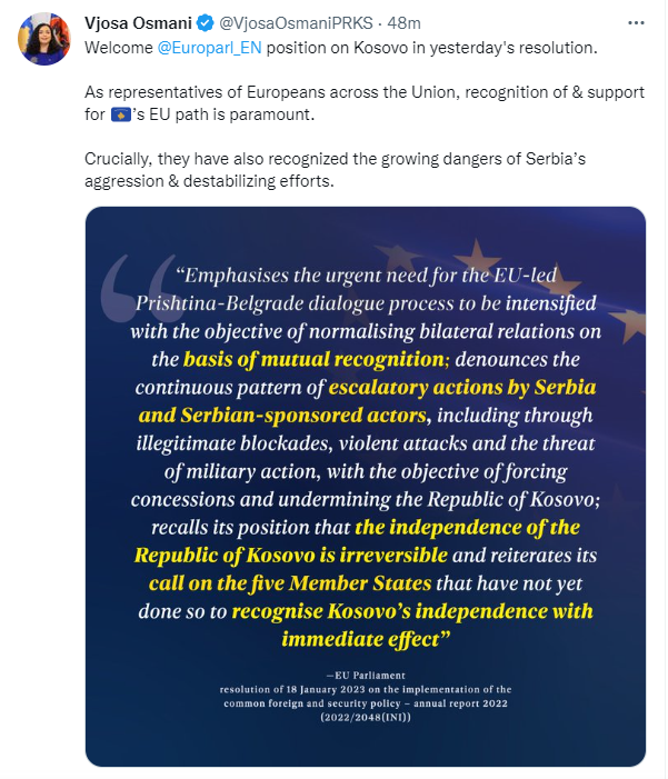 Osmani ka shpërndarë disa paragraf të raportit në Twitter, ku kërkohet që dialogu të përfundojë me njohje të ndërsjellë. Po ashtu, aty theksohet se Pavarësia e Kosovës është e pakthyeshme, si dhe i bëhet thirrje pesë shteteve anëtare të BE-së që ta njohin Kosovën.