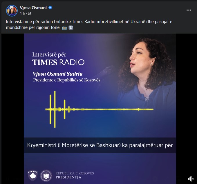 Osmani për radion britanike “Times Radio”, ka folur lidhur me rrethanat e krijuara në Ukrainë dhe efektin që mund ta kenë në destabilizimin e Ballkanit Perëndimor, me theks të veçantë në Kosovë.