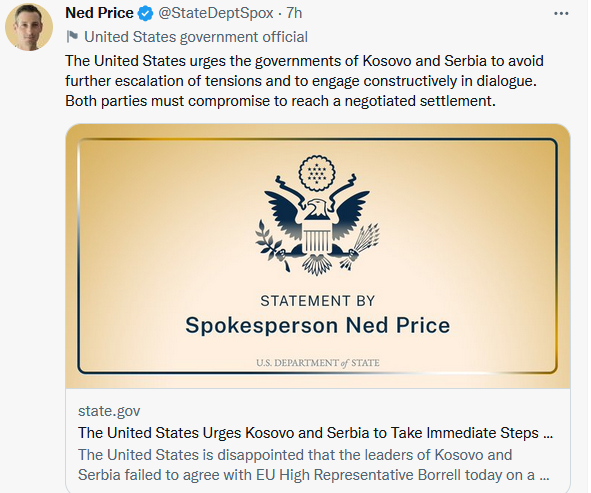 Shtetet e Bashkuara të Amerikës kërkojnë nga Kosova dhe Serbia që të ndërmarrin hapa të menjëhershëm për të zbutur tensionet. Ned Price, zëdhënës i Departamentit Amerikan të Shtetit (DASH), thotë se Uashingtoni është i zhgënjyer që liderët e Kosovës dhe Serbisë nuk arritën të bien dakord me përfaqësuesin e Lartë të BE-së, Josep Borrell për zgjidhjen e krizës aktuale në Kosovë.