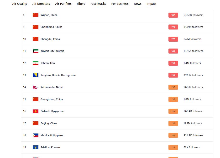 Prishtina po renditet e 19-ta në botë, sa i përket ajrit të ndotur.