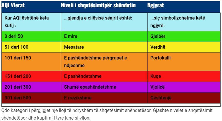 Një mjet për ta matur këtë është Indeksi i cilësisë së ajrit (AQI), i cili i kthen të dhënat e cilësisë së ajrit në numra dhe ngjyra për t’iu ndihmuar njerëzve të kuptojnë se kur duhet marrë masa për ta mbrojtur shëndetin e tyre.