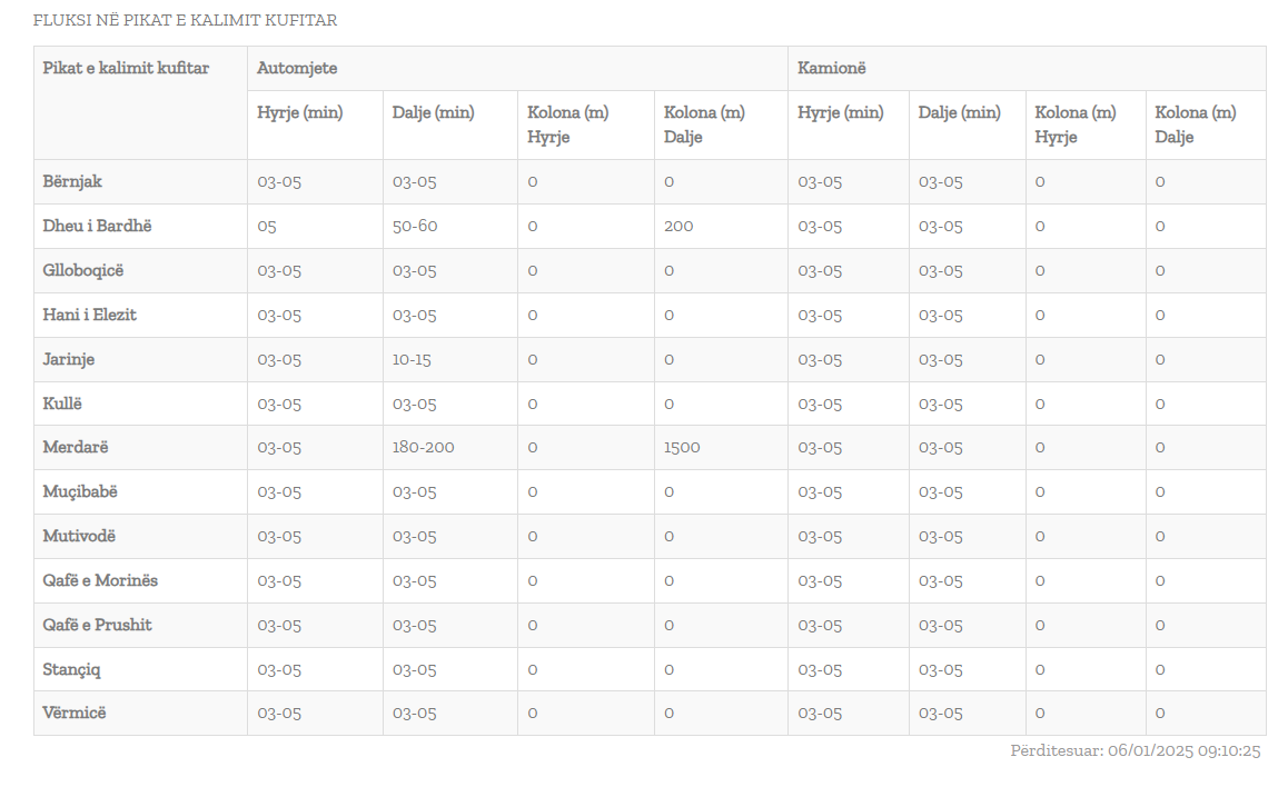 Ndërkohë, në pikën kufitare të Dheu i Bardhë, pritjet janë më të shkurtra, duke zgjatur rreth 1 orë me një kolonë prej rreth 200 metrash.