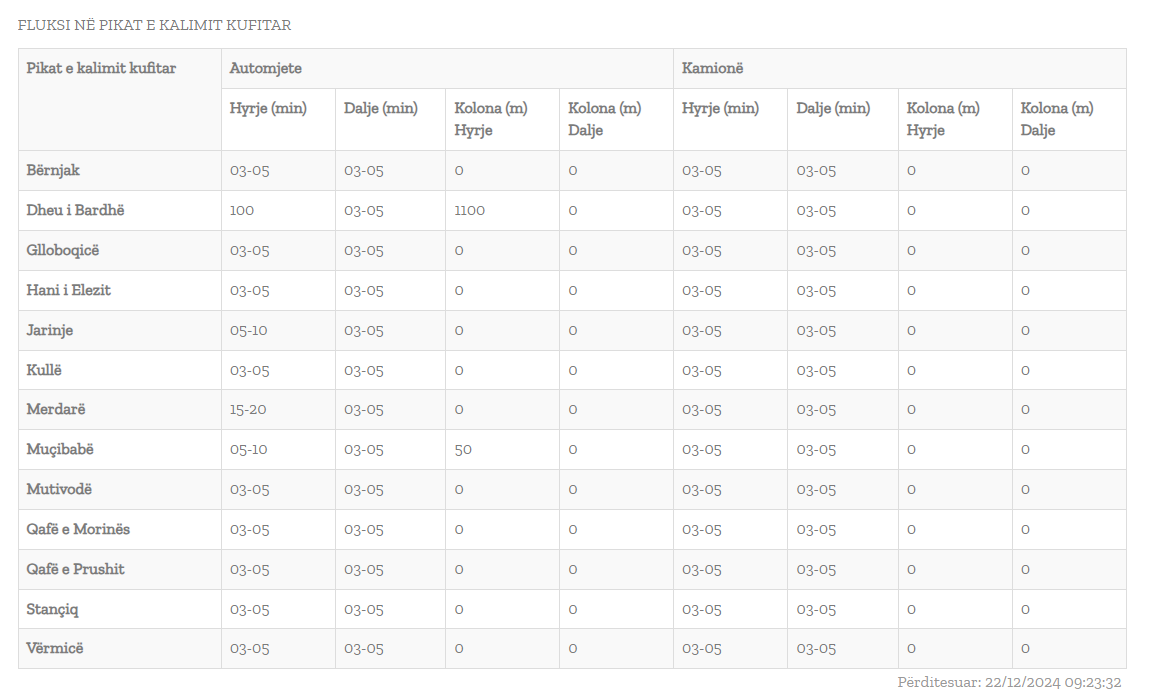 Sipas të dhënave të përditësuara sot rreth orës 09:23, në pikat tjera kufitare pritjet nuk janë të gjata./Arbresh.info/