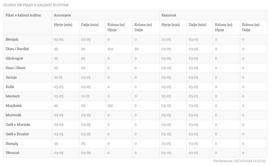 Sipas Qendrës Kombëtarë për Menaxhim Kufitar, deri në 25 minuta pritje ka edhe te pika kufitare e Dheut të Bardhë.