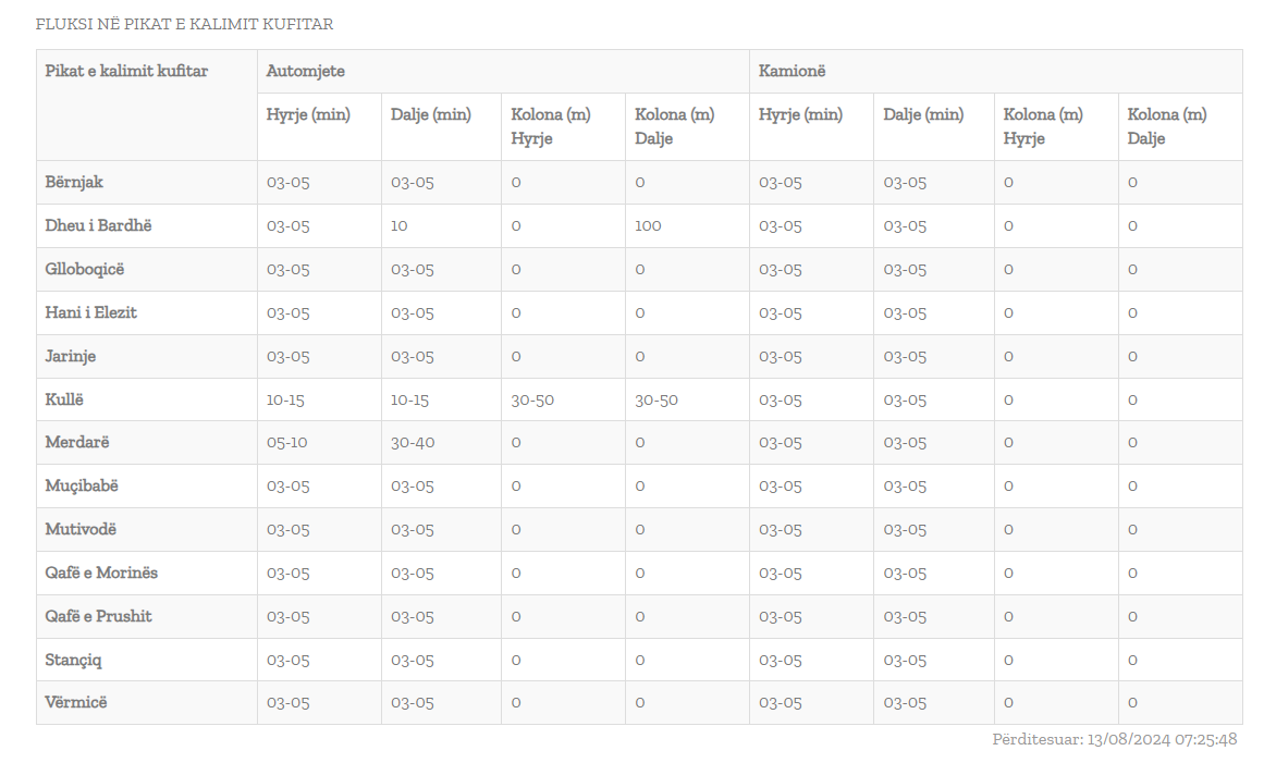 Sipas të dhënave, pritjet më të gjata për dalje nga Kosova janë në Merdarë me rreth 30-40 minuta pritje, teksa te Dheu i Bardhë pritjet janë deri në 10 minuta e kolonat deri në 100 metra.Më poshtë gjendja momentale e të gjitha pikëkalimeve kufitare.