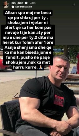 “Alban, s’po muj me besu që po shkruj për ty, shoku jem i vjetër e i afërt që, sa herë kom pasë nevojë, ti je kanë aty për mu e unë për ty. 2 ditë ma herët, kur folëm afër 1 orë, asnjë shenjë s’ma dhe që ka më kanë biseda jonë e fundit. Pusho në paqe shoku jem, nuk kam me të harru kurrë”, shkroi Bini.